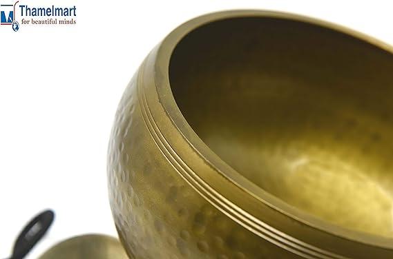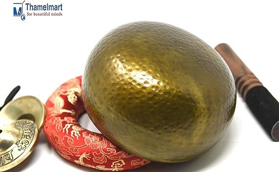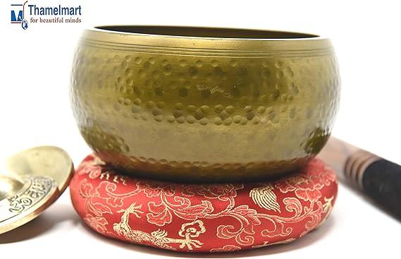 Fits in your Palm ~ Perfect Gift: this singing bowl easily fits in the palm of your hand, looks great on your desk or shelf and adds harmonious flavor to your decor. Its approximately 5.5” diameter with 3” height. It weighs approx. 1.5lb / or 24 oz or 700 grams. Also included suede leather wrapped Wooden mallet (Striker) and thick Hand sewn thick silk Cushion and Om Nama Shiva embossed Tingsha Cymbals. Make this Singing Bowl a Perfect Gift set to anyone who loves Yoga and meditation.